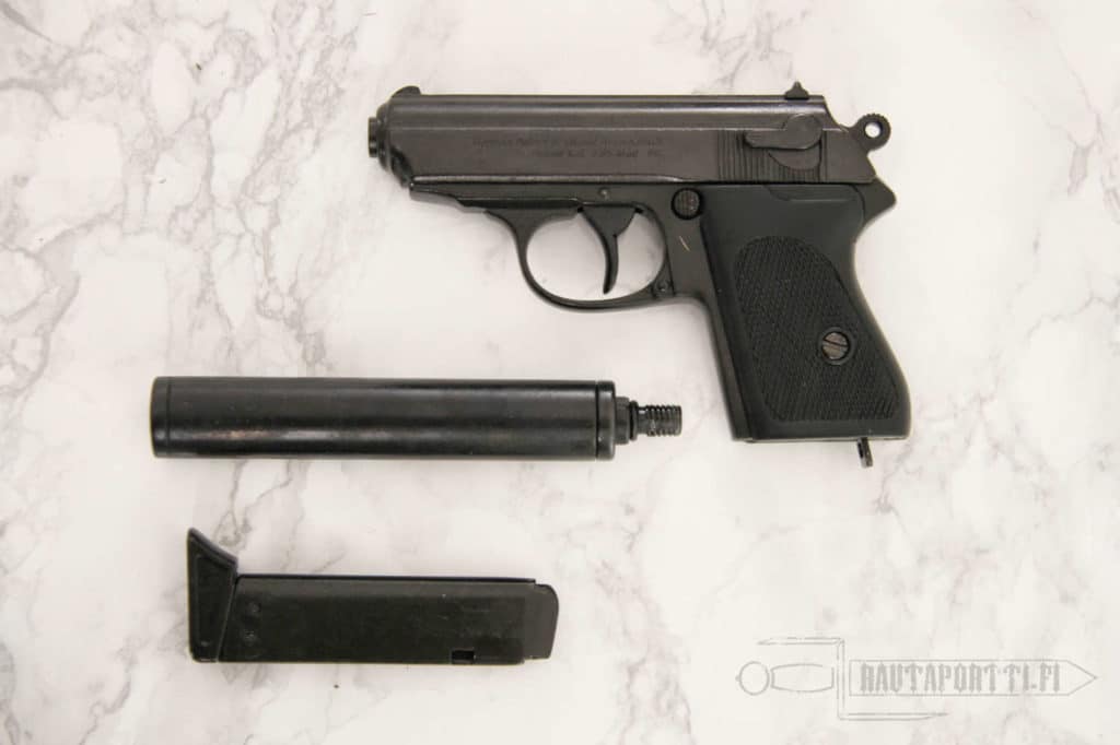 PPK fires 7.65mm bullets that fit 7 to a magazine. It is effective for a few dozens of meters. In practice, such a small pistol is always used over very short distances. A silencer at the end of the barrel muffles the sound of shooting and allows secret, unobtrusive operations. The silencer included in this package can be screwed to the end of the gun whenever necessary, ie the gun can either be used as is, or with a silencer for special operations.