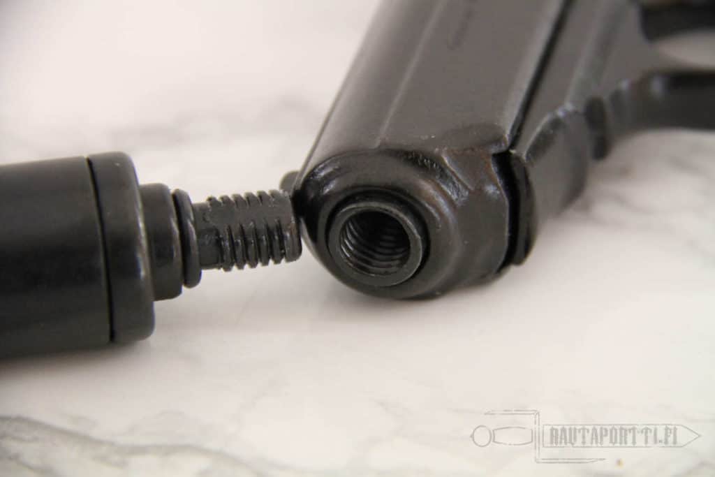 This replica pistol is made of light cast metal, with plastic handle plates. The weapon can be cocked and dry fired like a real one. The slider moves and the magazine can be removed. The silencer can be removed and screwed back on like a genuine one.