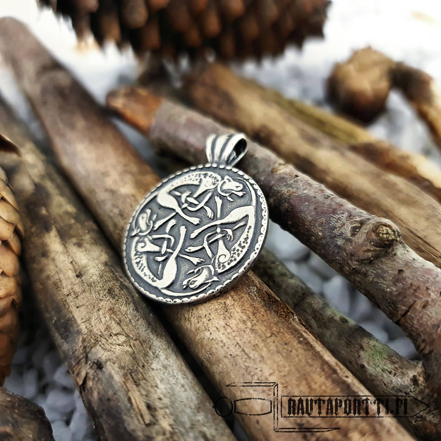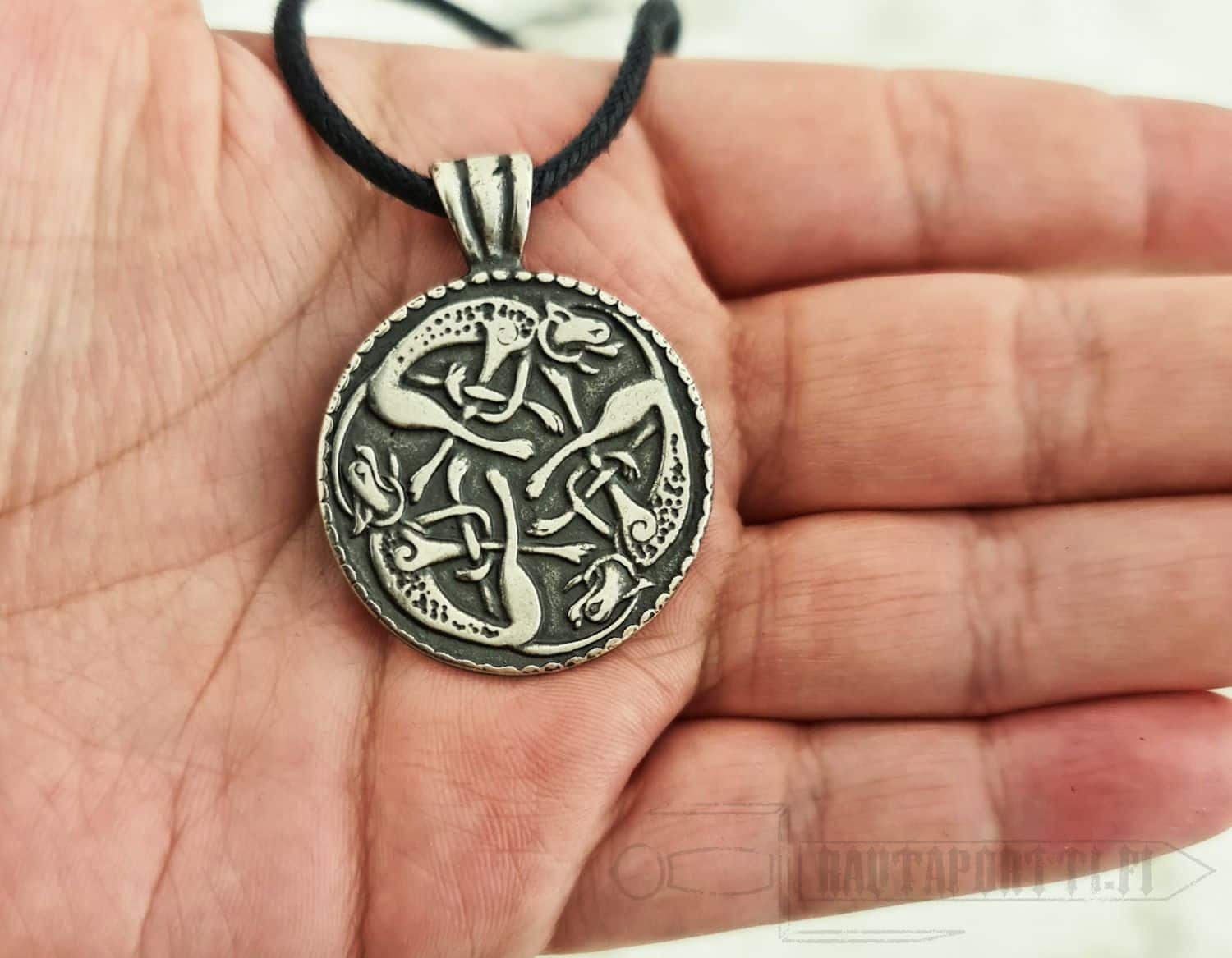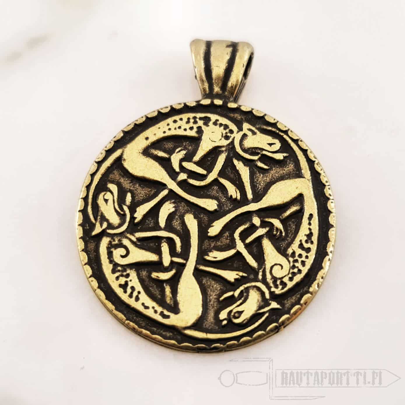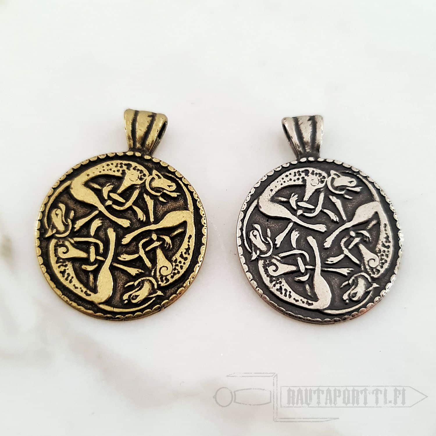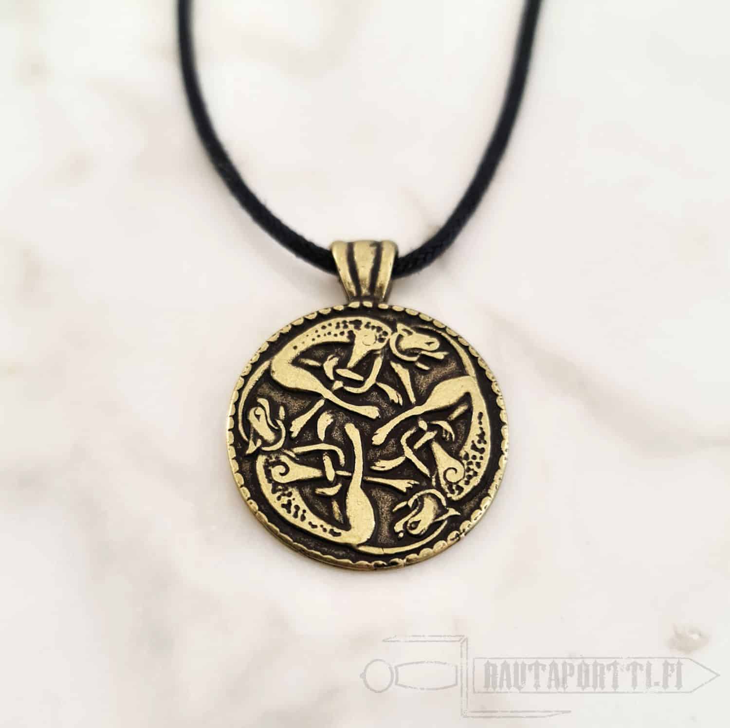 The design of this pendant is inspired by an illustration found in the early medieval Book of Kells. The illustration depicts Cŵn Annwn, the Celtic hounds of the underworld. Cwn Annwn were ghostly dogs that appeared at night and foretold death, and they were led by the king of the underworld, Arawn. These hounds were sent from Annwn (the underworld) to search for bodies and human souls. In this pendant, the three hounds chase each other, forming a triskele or triple spiral with their bodies. The triskele is said to symbolize life, death, and rebirth among the Celts.
