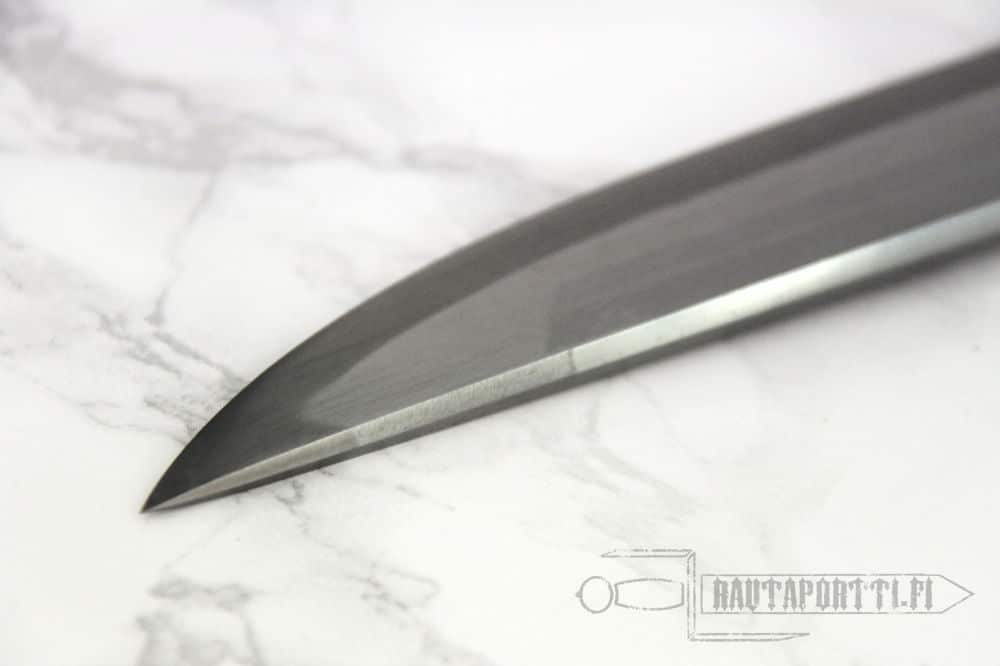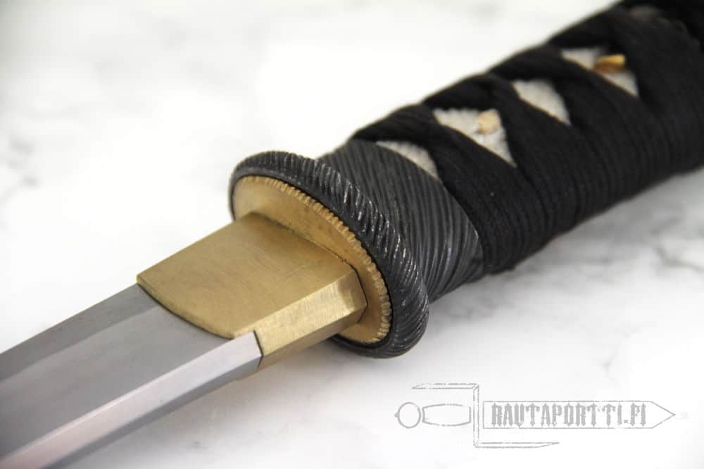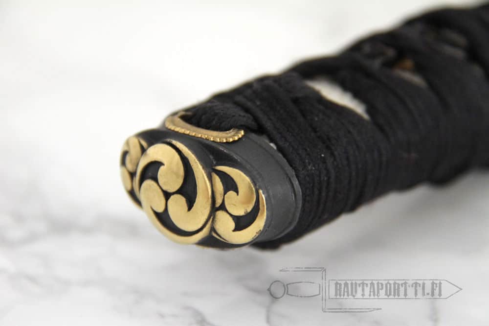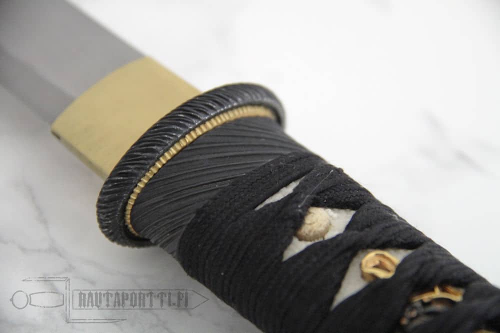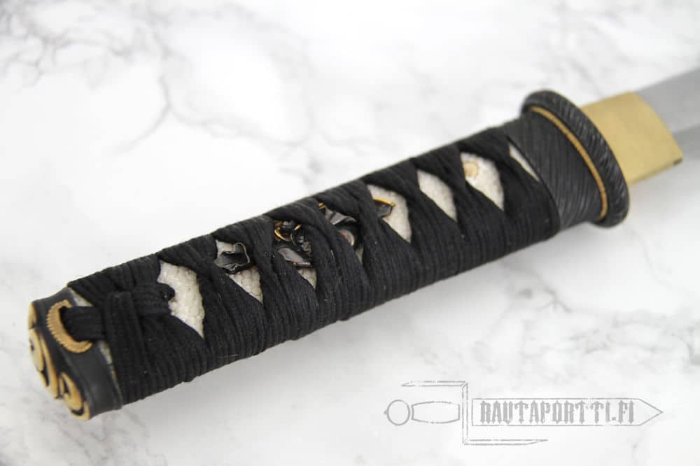 The tsuba, fushi and kashira are crafted of blackened stainless steel. The tsuka is wrapped in genuine same (ray skin) and the tsuka-ito is premium Japanese black cotton. The saya is finished in a traditional black lacquer with a black cotton sageo.