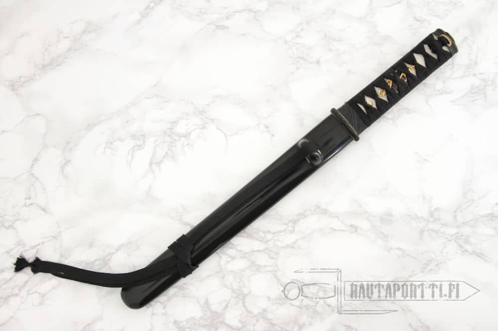 - The saya (scabbard) is finished in a traditional black lacquer with a black cotton sageo