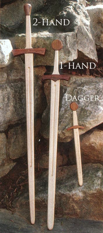 A medieval practice sword is the perfect companion for medieval combat training in a completely safe manner. A wooden sword, or waster, allowed a warrior to practice full combat safely and economically while preserving his precious steel for the real battle to come. Fully seasoned and hand crafted in solid hardwood, with contrasting wood guard and pommel, to be strong enough to meet the needs of today’s swordsman (or woman). Each can take the abuse of sparring and reenacting, even edge-to-edge. (Keep in mind, however, that wood can break along the grain.) The Medieval Practice Weapon design represents edged weapons common from the 12th to 15th centuries.