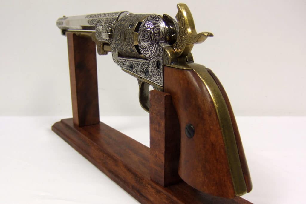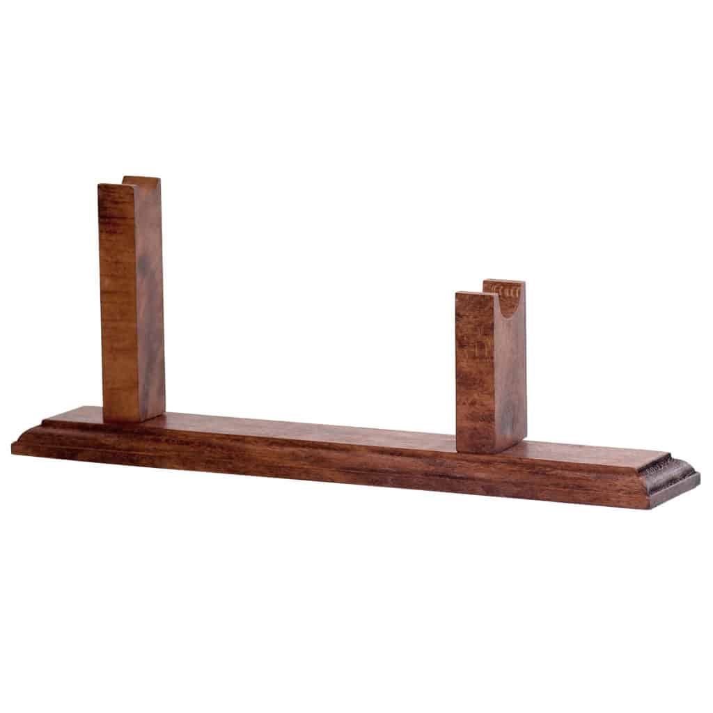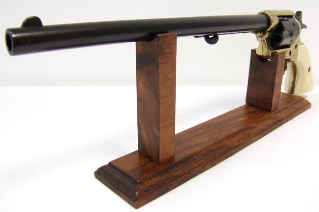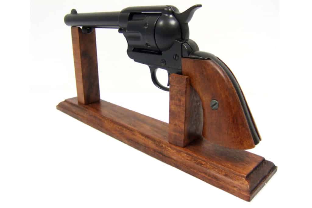 Balancing some weapons for display is tricky. This wooden stand is ideal for displaying various types of revolvers on a table or on a bookshelf, but it is just as suitable for other types of weapon too, for example daggers etc.