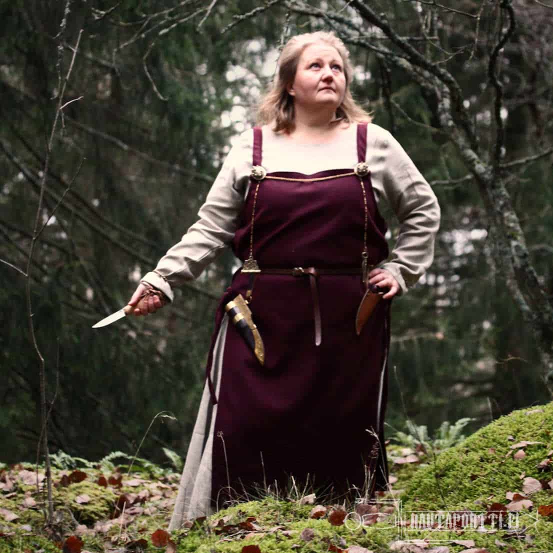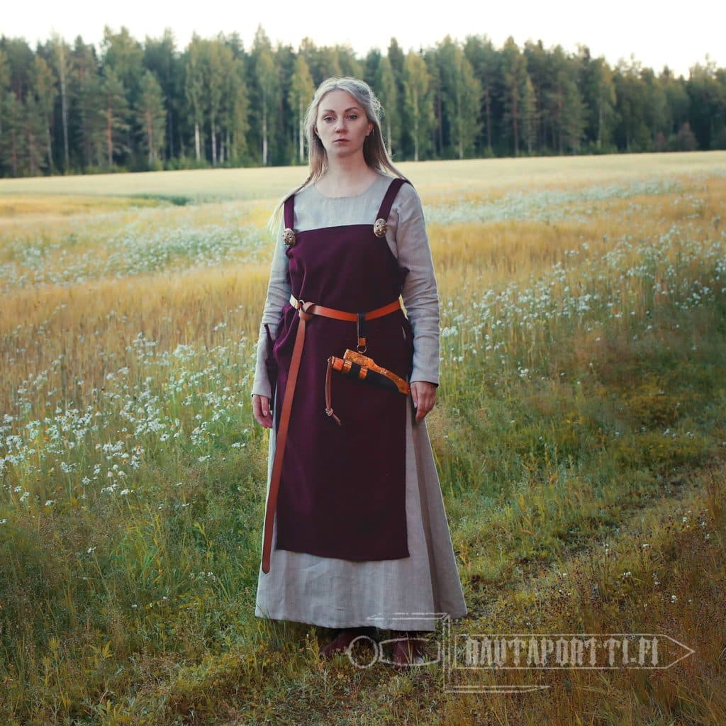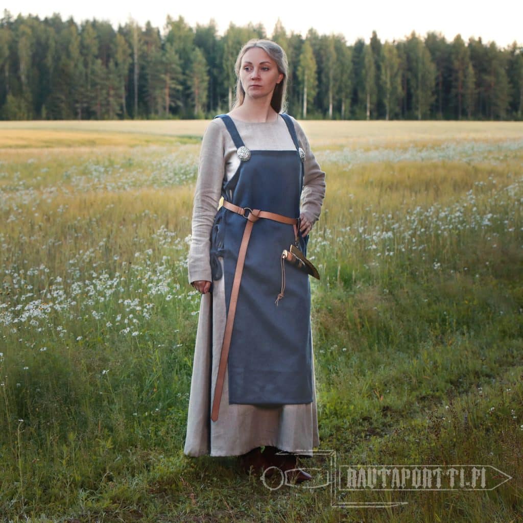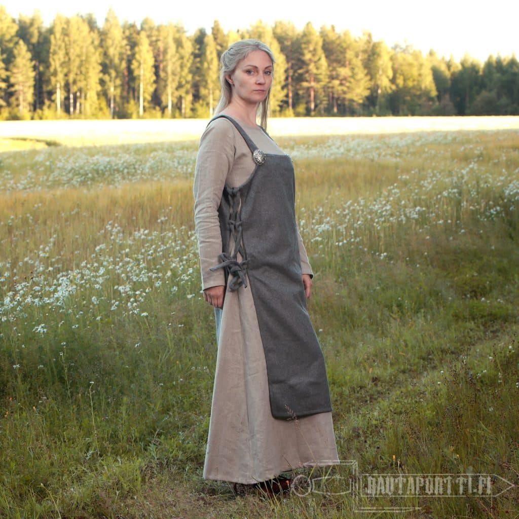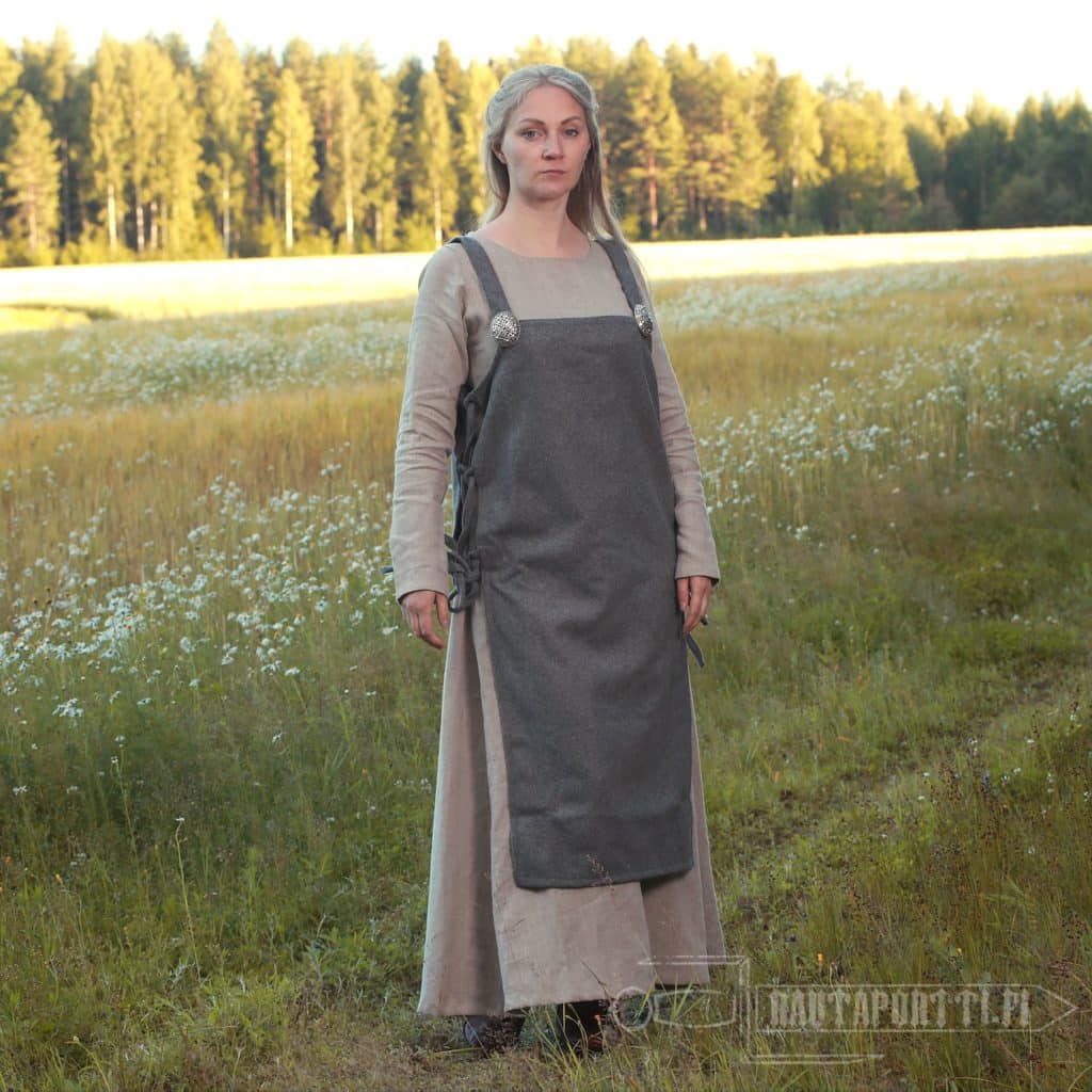 The costume of a Scandinavian woman in the Viking Age consisted of a long underdress and a woolen apron dresses over this. The underdress was made of linen or wool, but the over dresses were typically always made of wool. The apron dress hangs with shoulder straps, which in this model are sewn to the body at the front and the back. According to Viking finds, the shoulder straps were often fastened using two brooches in the front, so if you want to easily add a bit of wealth and Viking style to your outfit, you can use brooches with this apron dress. Back in the day, the shoulder straps were sewn on at the back, but the tortoise brooches at the front served as decorations in addition to closing the garment. The brooches also functioned as a base to attach many functional decoration pieces hanging from metal chains to the clothing. Functional pieces worn from the brooches at the end of metal chains were for example tweezers, small knives, needle boxes, ear spoons and keys.