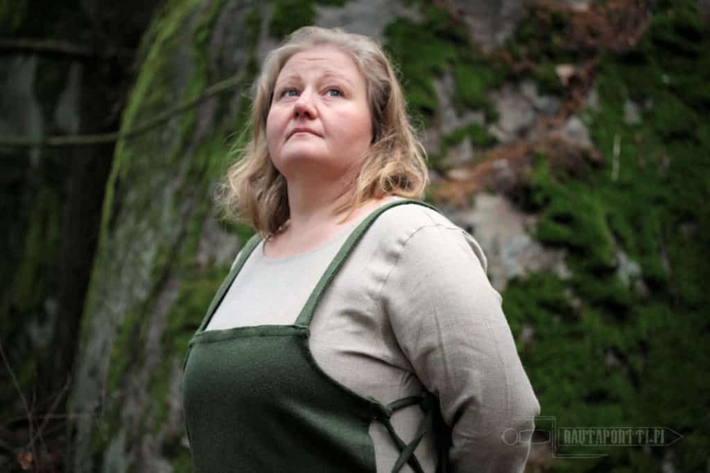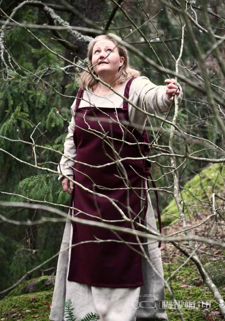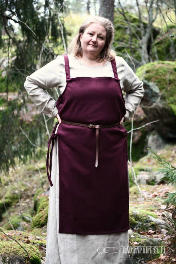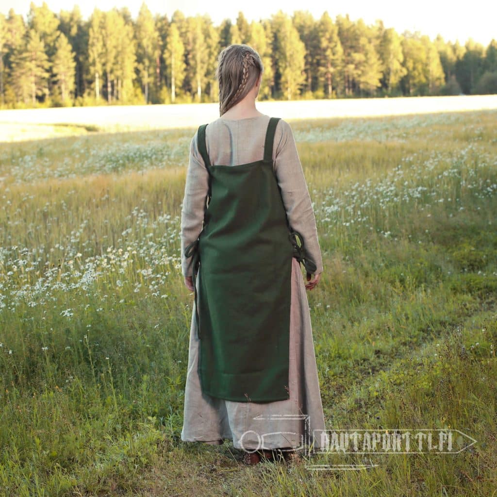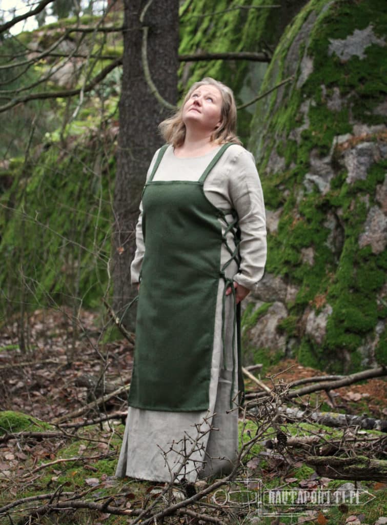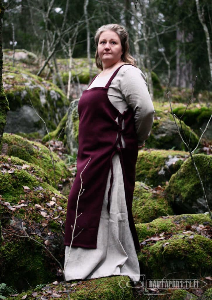A typical Viking woman’s apron dress has tubular shape and short straps over the shoulders. At its simplest, the shoulder straps are sewn right onto the dress, as in this model, and the apron dress is not decorated with decorative borders, embroidery and/or metal decorations. Adding decorations showed off wearer’s wealth and adding decorations transformed this regular clothing worn everyday as a wear for celebrations, ceremonies and parties. Decorative shoulder brooches (called tortoise brooches), decorative ribbons around the edges, embroidery (sometimes with silk), metal chains hanging from the brooches and glass bead necklaces were the viking way of adding individual style to the outfit. We have left this apron dress unadorned, as a suitable base for many different styles. This kind of apron dress is also called Smokkr, Hangerok and sometimes as Pinafore.