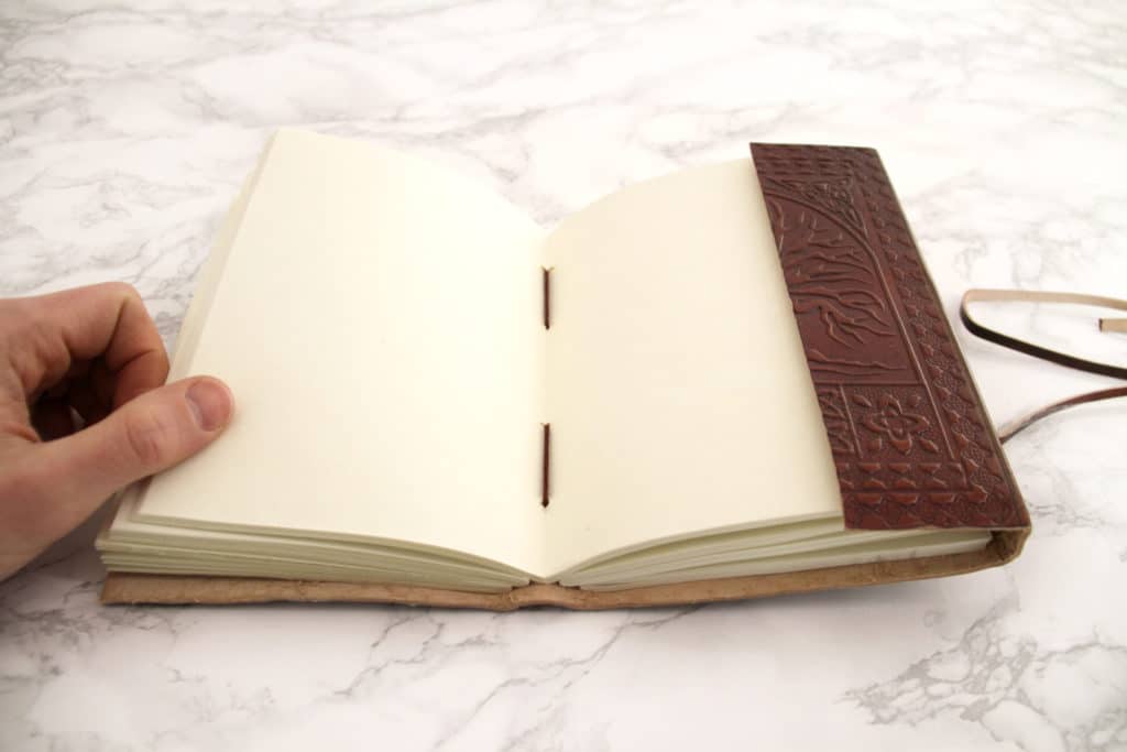 Book can be closed and tied using a leather strap. Thickness of the cover leather is approx. 2 mm. Approx. 200 writable pages.