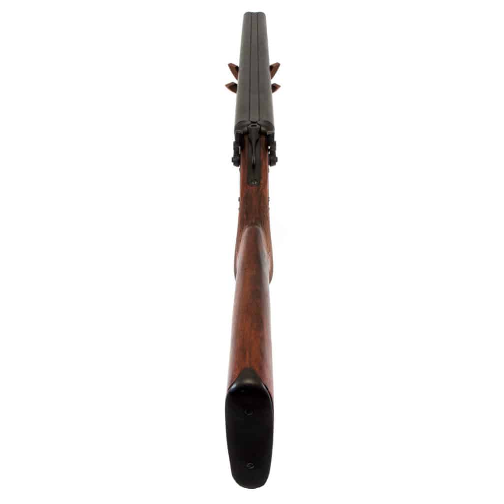 This shotgun has two drilled barrels and its own trigger for both hammers. The hammers can be triggered as in the originals. The barrel folds open and locks closed. The stock is rosewood.